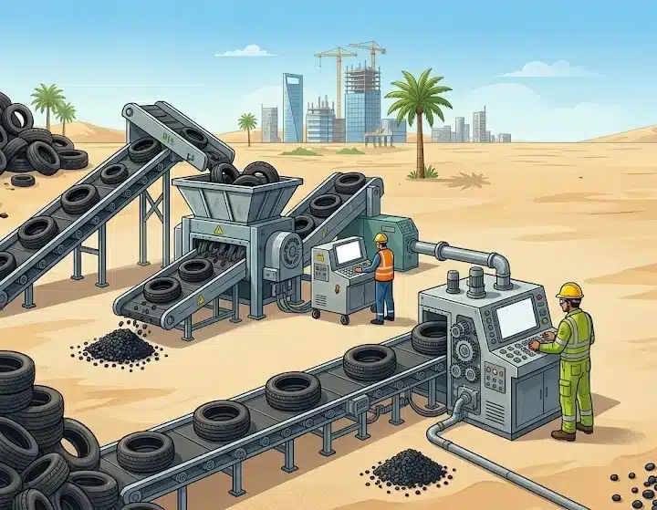 • مشروع صناعي متخصص في إعادة تدوير الكفرات المستعملة وتحويلها إلى منتجات قابلة للبيع (مثل: حبيبات المطاط، بودرة المطاط، وقود بديل).